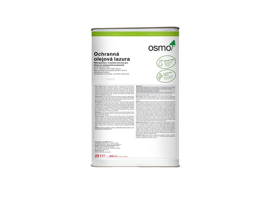 Popis výrobku:Ochranná olejová lazura je polomatný nátěr na bázi přírodních olejů na veškeré dřevo ve vnějších prostorách. S otevřenými póry, nechá dřevo dýchat, snižuje bobtnání a sesýchání. Odpuzuje vodu, je mimořádně odolný vůči povětrnosti a UV záření. Nátěr obsahuje účinné látky k preventivní ochraně nátěru před napadením plísní, řasou a houbou. Neodprýskává, nepraská a neodlupuje se.